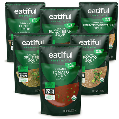Can’t decide which flavor to try first? With our Discovery Set, you don’t have to. Enjoy all six of Eatiful’s comforting Everyday Soups - Organic Black Bean, Country Vegetable, Split Pea, Lentil, Potato, and Tomato. Each pouch is crafted from simple, organic ingredients and slow-cooked for rich, homemade flavor. It’s the perfect way to taste the full range, find your favorites, and keep wholesome meals on hand for every mood.